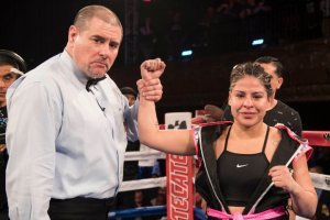 Marlen Esparza (5-0, 1 KO), the 2012 Olympic Bronze Medalist of Houston, Texas, scored an exciting third-round TKO victory against Laetizia Campana (2-5) of Philadelphia, Pa. in the exciting main event of the April 6 edition of LA FIGHT CLUB at the Belasco Theater in Los Angeles, Calif. and televised nationally on EstrellaTV’s Boxeo Estelar. Photo by Lina Baker.